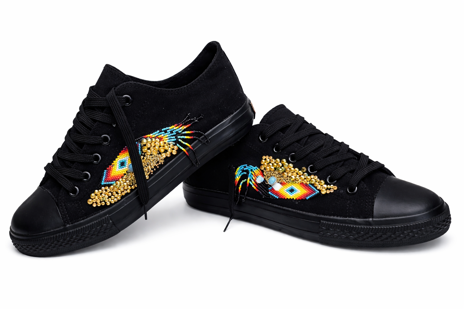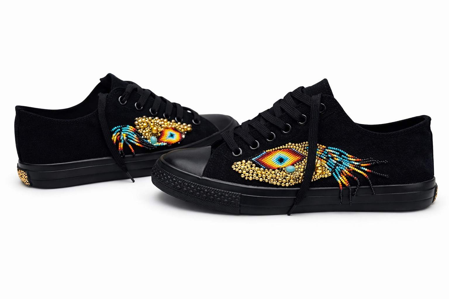 Step into style with these handcrafted beaded black sneakers designed to turn heads. Each pair features a vibrant peacock feather–inspired bead pattern, combining gold accents with colorful details for a bold, artistic look. These shoes are perfect for women who love unique fashion, statement pieces, and one-of-a-kind footwear.